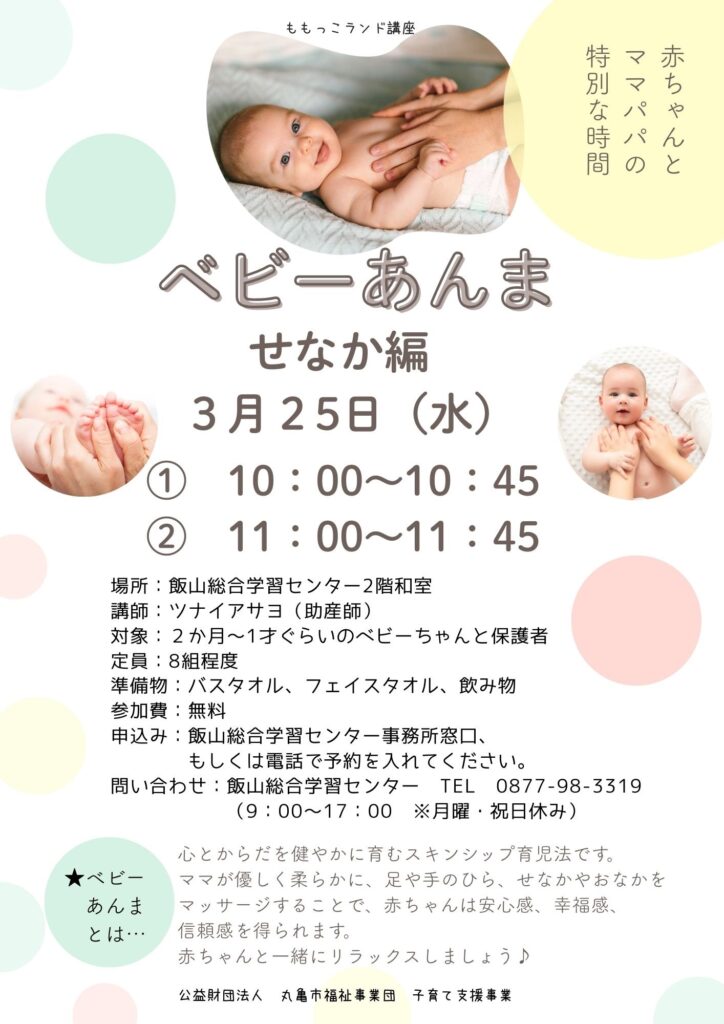 ベビーあんま 申込受付中! 2026年3月5日 最終更新日時 : 2026年3月5日 manabee-l 心とからだを健やかに育むスキンシップ育児法! 赤ちゃんと一緒にリラックスしましょう♪ ① 10:00~ 定員まで残り5組! ② 11:00~ 定員まで残り2組!