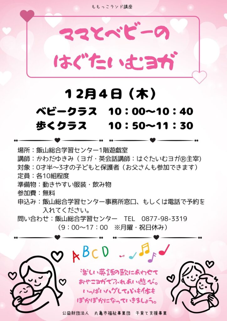 ママとベビーのはぐたいむヨガ 申込受付中! 2025年12月3日 最終更新日時 : 2025年12月3日 manabee-l 楽しい英語の歌にあわせておやこでふれあい遊び♡ ベビークラス 10:00~10:40 定員まで残り3組! 歩くクラス 10:50~11:30 定員まで残り7組!