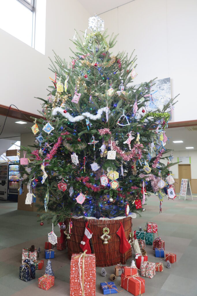 飯山総合学習センター1階ロビーに今年も大きなクリスマスツリーが登場しました。近くのこども園の子どもたちが心を込めて作ったオーナメントを飾りつけました。